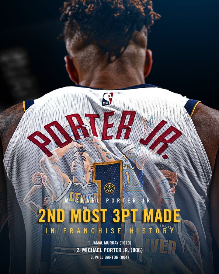 波特掘金生涯三分命中數(shù)來到806記 超越巴頓 升至隊(duì)史第2位
