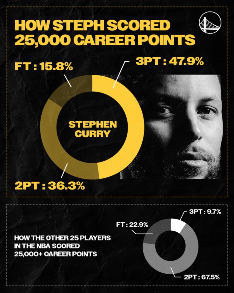 獨(dú)樹一幟!庫里25000分中得分方式占比:三分47.9% 罰球僅15.8%