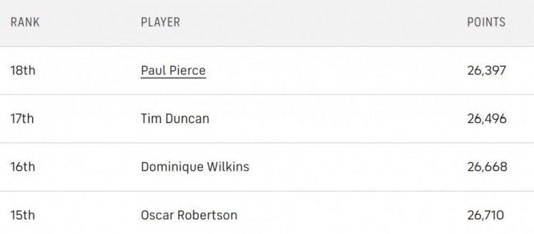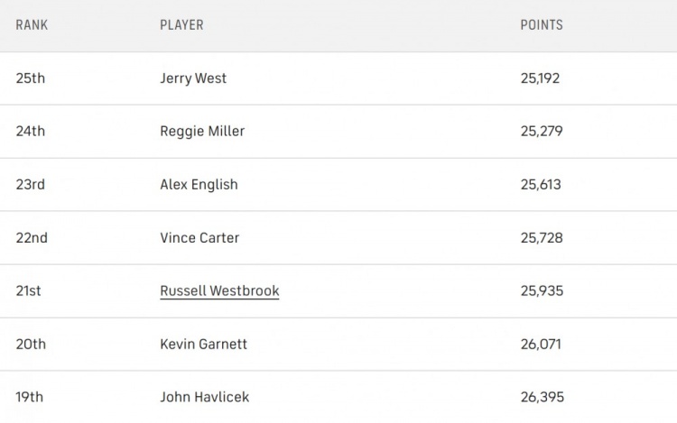 這是一個(gè)總得分非常接近的群體,而且這些球員都已退役,因此我們不需要擔(dān)心積分差距發(fā)生變化。庫(kù)里需要再得到1694分才能超越奧斯卡-羅伯特森并進(jìn)入前15名。這同樣是一個(gè)幾乎確定能達(dá)成的目標(biāo),甚至有可能在下賽季就實(shí)現(xiàn),只要庫(kù)里沒(méi)有長(zhǎng)時(shí)間缺席。本賽季庫(kù)里的場(chǎng)均得分是威少的兩倍,即使威少目前總得分更高,庫(kù)里也有很大機(jī)會(huì)先于他超越羅伯特森。