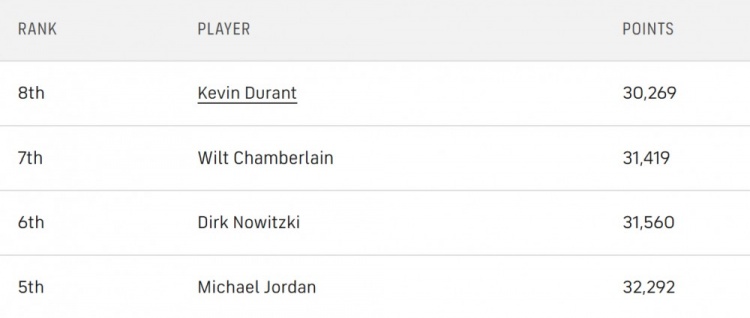 庫(kù)里是否有機(jī)會(huì)再超越其他人?或者達(dá)到30000分里程碑?以下是目前得分榜第8到第5位的情況: