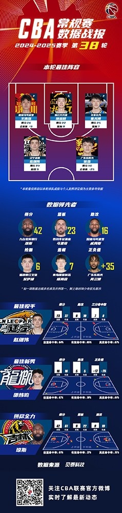 2024-2025賽季CBA聯(lián)賽常規(guī)賽第38輪結(jié)束較量,來(lái)自深圳新世紀(jì)烈豹籃球俱樂(lè)部的王浩然,浙江廣廈籃球俱樂(lè)部的胡金秋,北京首鋼籃球俱樂(lè)部的曾凡博,遼寧沈陽(yáng)三生飛豹籃球俱樂(lè)部的趙繼偉和廣東宏遠(yuǎn)籃球俱樂(lè)部的徐杰入選CBA聯(lián)賽常規(guī)賽第38輪最佳陣容!