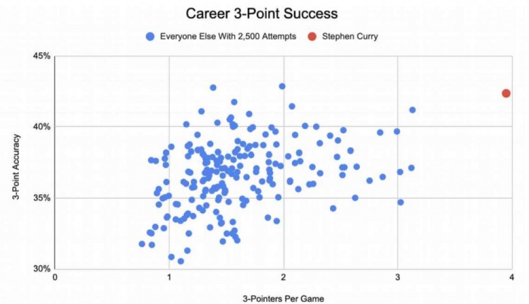 自2012-13賽季庫(kù)里成功控制住腳踝傷病并首次闖入季后賽以來(lái),他場(chǎng)均能投進(jìn)4.4記三分球,比排名第二的克萊-湯普森(場(chǎng)均3.3記)高出34%。