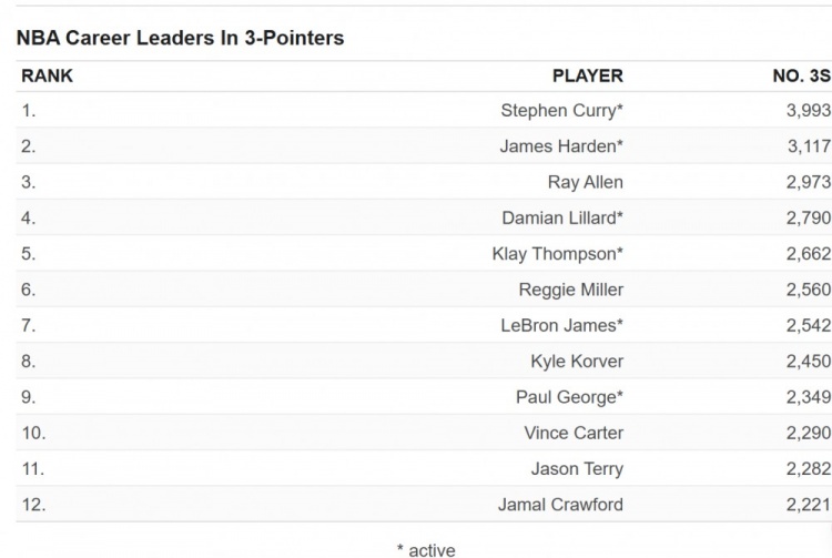 目前,雷-阿倫以歷史第三的三分球命中總數(shù)排在庫(kù)里和哈登之后,而利拉德(98%的概率)和克萊(97%的概率)幾乎肯定將在一兩年內(nèi)超越雷-阿倫。