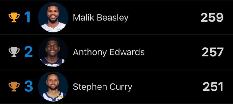 最終誰(shuí)會(huì)第1?聯(lián)盟三分榜前3:比斯利259 華子257 庫(kù)里251