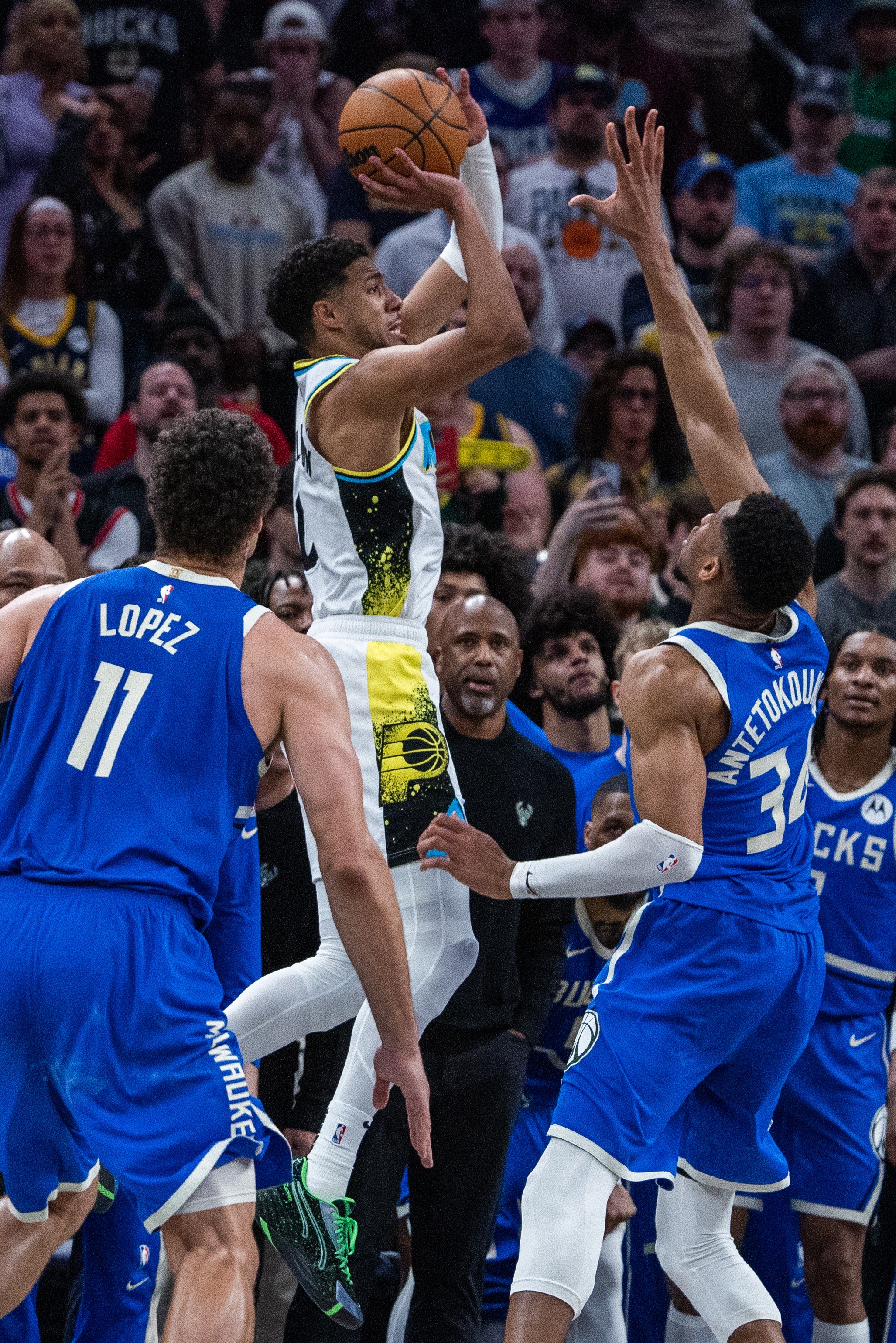 哈利伯頓在比賽最后時刻沿左側(cè)邊線切入,接手遞手邊線發(fā)球,面對字母哥的防守,在空中失衡的情況下命中后仰漂移三分,并且獲得了加罰。哈利伯頓罰球命中取得1分領(lǐng)先優(yōu)勢后,只留下3.4秒,字母哥接球沖到前場三分不中,步行者取得比賽勝利。