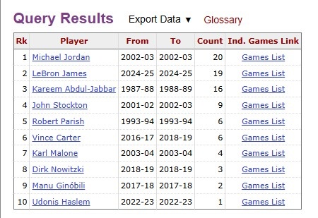 根據(jù)數(shù)據(jù)統(tǒng)計,這是詹姆斯40歲后的第20次20+,他追平喬丹,并列40歲之后20+場次排行榜第一。