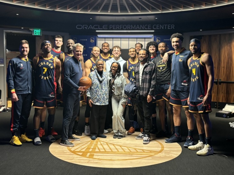 賽后,勇士隊工作人員做出溫馨的安排,阿爾-阿特爾斯的妻子將比賽用球交給了科爾,眾人一起合影留念。