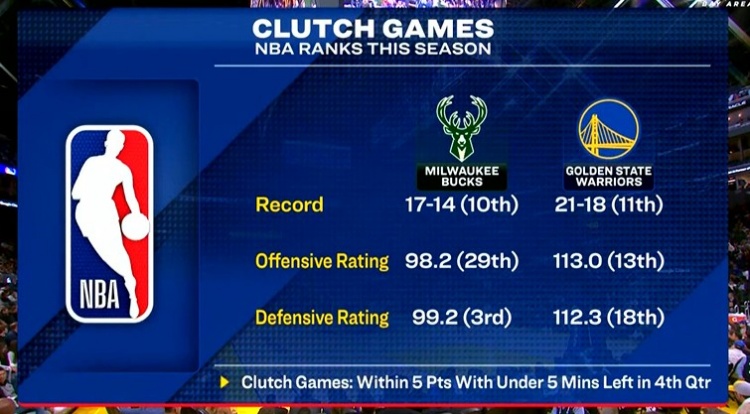 比賽末節(jié)雙方比分緊咬,轉(zhuǎn)播方曬出兩隊(duì)本賽季關(guān)鍵時(shí)刻的數(shù)據(jù):