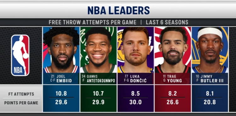 近6賽季場(chǎng)均罰球TOP5:恩比德 字母哥 東契奇 特雷-楊 巴特勒