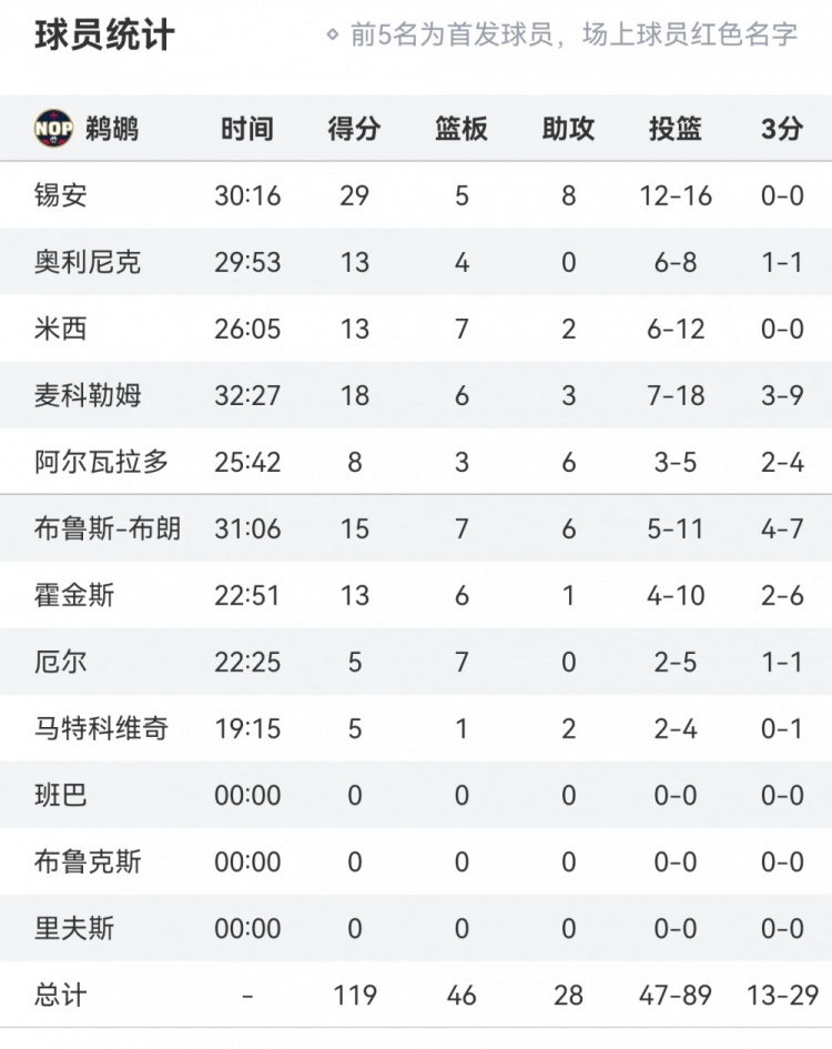 本場(chǎng)比賽,鵜鶘全隊(duì)多點(diǎn)開花,共6人得分上雙。具體如下: