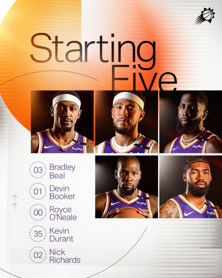 今日對(duì)陣猛龍!太陽首發(fā):比爾、KD、布克、R-奧尼爾、理查茲