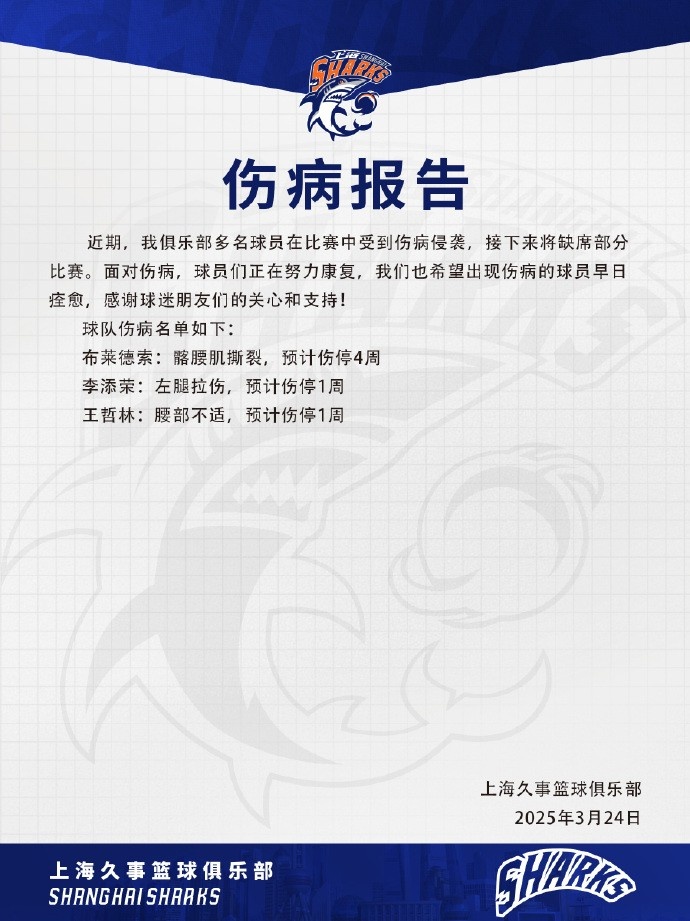 3月24日訊 今天,上海男籃發(fā)布了球隊(duì)的傷病報(bào)告。