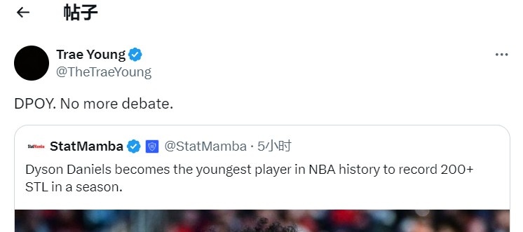 比賽結(jié)束后,老鷹球星特雷-楊轉(zhuǎn)發(fā)了丹尼爾斯的這一數(shù)據(jù),并在旁邊寫道:“年度最佳防守球員。停止?fàn)幷?。?/p>