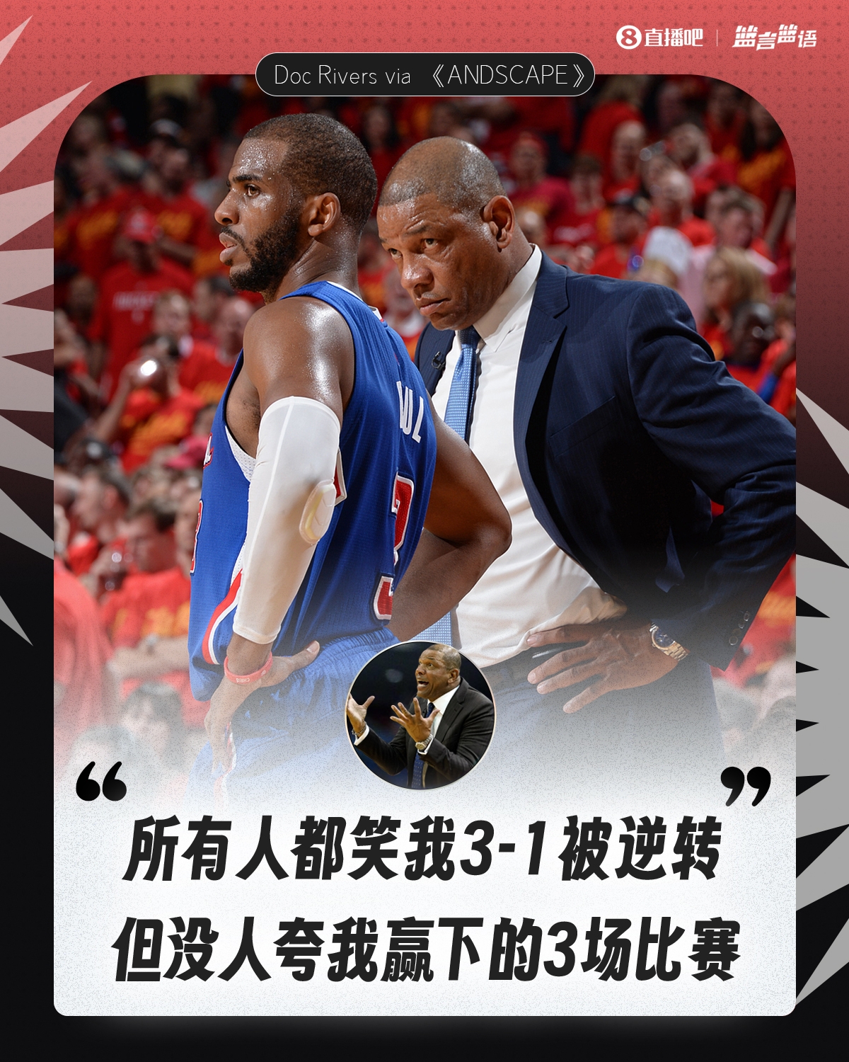 在談到自己飽受詬病的“系列賽多次3比1領(lǐng)先被翻盤”的話題時,里弗斯坦然表示:“我曾帶領(lǐng)一支排名第8的球隊3比1領(lǐng)先。在快船的那次是唯一一次讓勝利溜走了,沒有人講出真實的故事,沒人意識到保羅當(dāng)時拖著一條傷腿在場上奔跑。這在某種程度上是不公平的,我贏得3場勝利沒有得到足夠的認(rèn)可,大家只記住了輸?shù)舻谋荣悺N铱偸钦f,‘如果我們6場內(nèi)輸給火箭會怎樣?那就沒人在意了。’”
