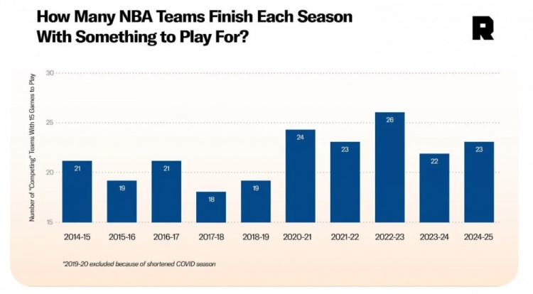 事實(shí)上,過(guò)去五個(gè)賽季的數(shù)據(jù)顯示,在常規(guī)賽剩余15場(chǎng)時(shí),平均每年仍有23.6支球隊(duì)保有至少爭(zhēng)奪附加賽席位的希望。其中2022-23賽季尾聲階段多達(dá)26支球隊(duì)保有競(jìng)爭(zhēng)資格,而上賽季同期最低也有22支。相比此前五年(2014-15賽季至2018-19賽季)19.6支球隊(duì)的平均值,新版制度讓競(jìng)爭(zhēng)球隊(duì)數(shù)量提升了整整4支,畢竟參與季后賽的名額從16個(gè)擴(kuò)充到了20個(gè)(含附加賽)。但關(guān)鍵在于,這一改變確實(shí)激勵(lì)了第11名及之后的球隊(duì)保持斗志。從效果來(lái)看,目標(biāo)基本達(dá)成了。