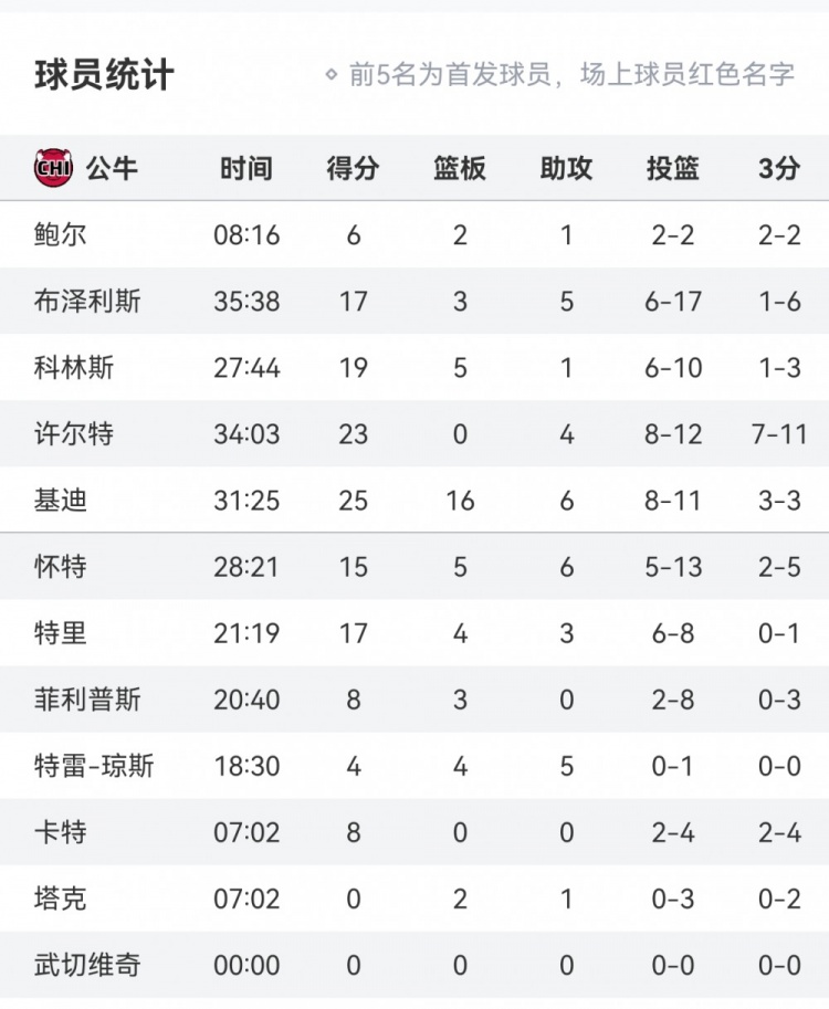 無(wú)敵!公牛全隊(duì)轟下142分&6人得分15+ 基迪25分/許爾特23分