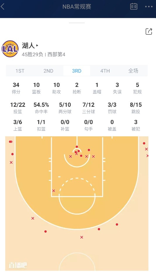 第三節(jié),湖人外線火力全開,單節(jié)三分12投7中,單節(jié)轟下34分,凈勝火箭5分。