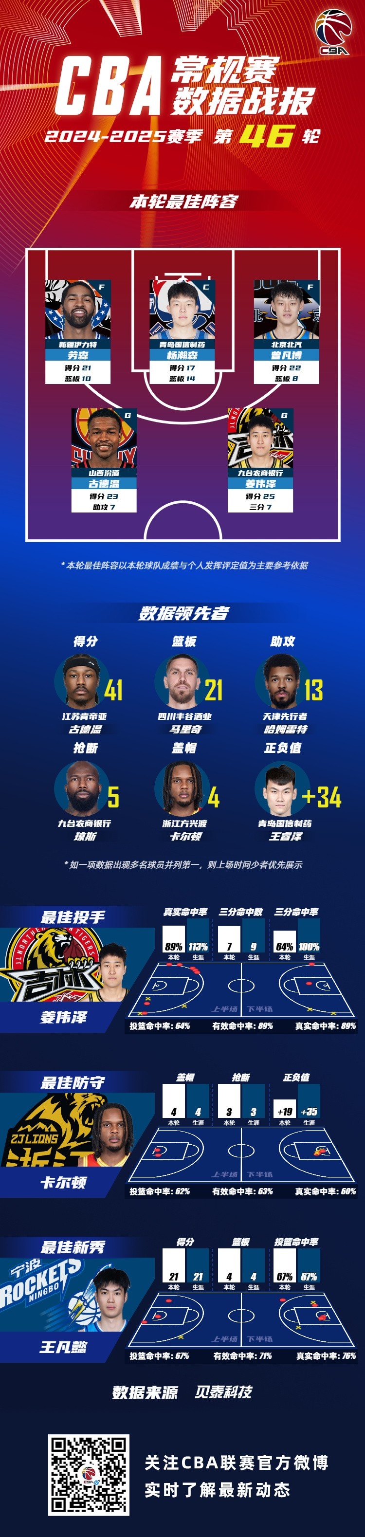 2024-2025賽季CBA聯(lián)賽常規(guī)賽第46輪結束較量,來自新疆廣匯籃球俱樂部的勞森,青島國信海天籃球俱樂部的楊瀚森,北京首鋼籃球俱樂的曾凡博,山西汾酒職業(yè)籃球俱樂部的古德溫和吉林東北虎男籃的姜偉澤入選CBA聯(lián)賽常規(guī)賽第46輪最佳陣容!