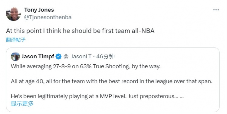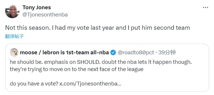 之后,被網(wǎng)友問到有沒有投票權(quán)時,Tony Jones回復(fù):“不是這個賽季。上賽季我有投票權(quán),我把他列在二陣?yán)锩妗!?/p>