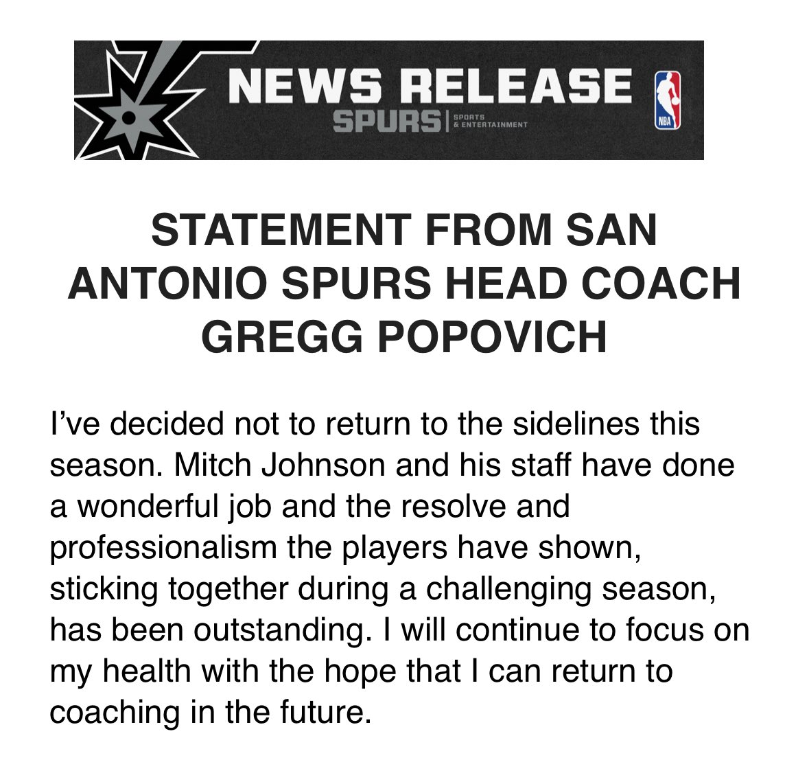 波波維奇在聲明中表示:“我決定本賽季不會再回到場邊,米奇-約翰遜和其團隊的工作做得非常不錯,球員們也表現(xiàn)出了決心和職業(yè)精神,他們在充滿挑戰(zhàn)的賽季中團結(jié)一致,非常出色。我會繼續(xù)關(guān)注我的健康狀況,希望未來能重返教練崗位。”