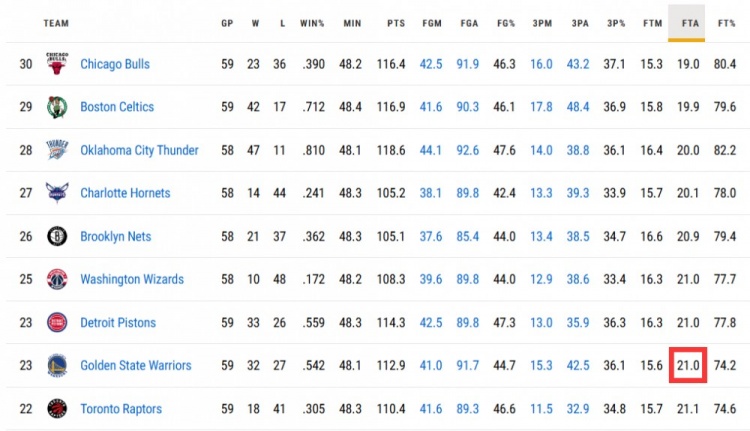 本場比賽之前,勇士本賽季場均20.7次罰球,聯(lián)盟第5少。