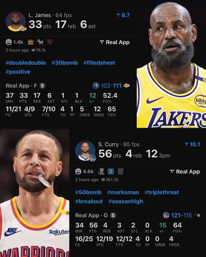庫里和詹姆斯都在各自參加的比賽中打出了精彩的表現(xiàn),庫里25中16(三分19中12)、罰球12中12,瘋狂砍下56分4板3助2斷!老詹21投11中,三分9中4,罰球10中7,得到33分17籃板6助攻1搶斷1蓋帽。
