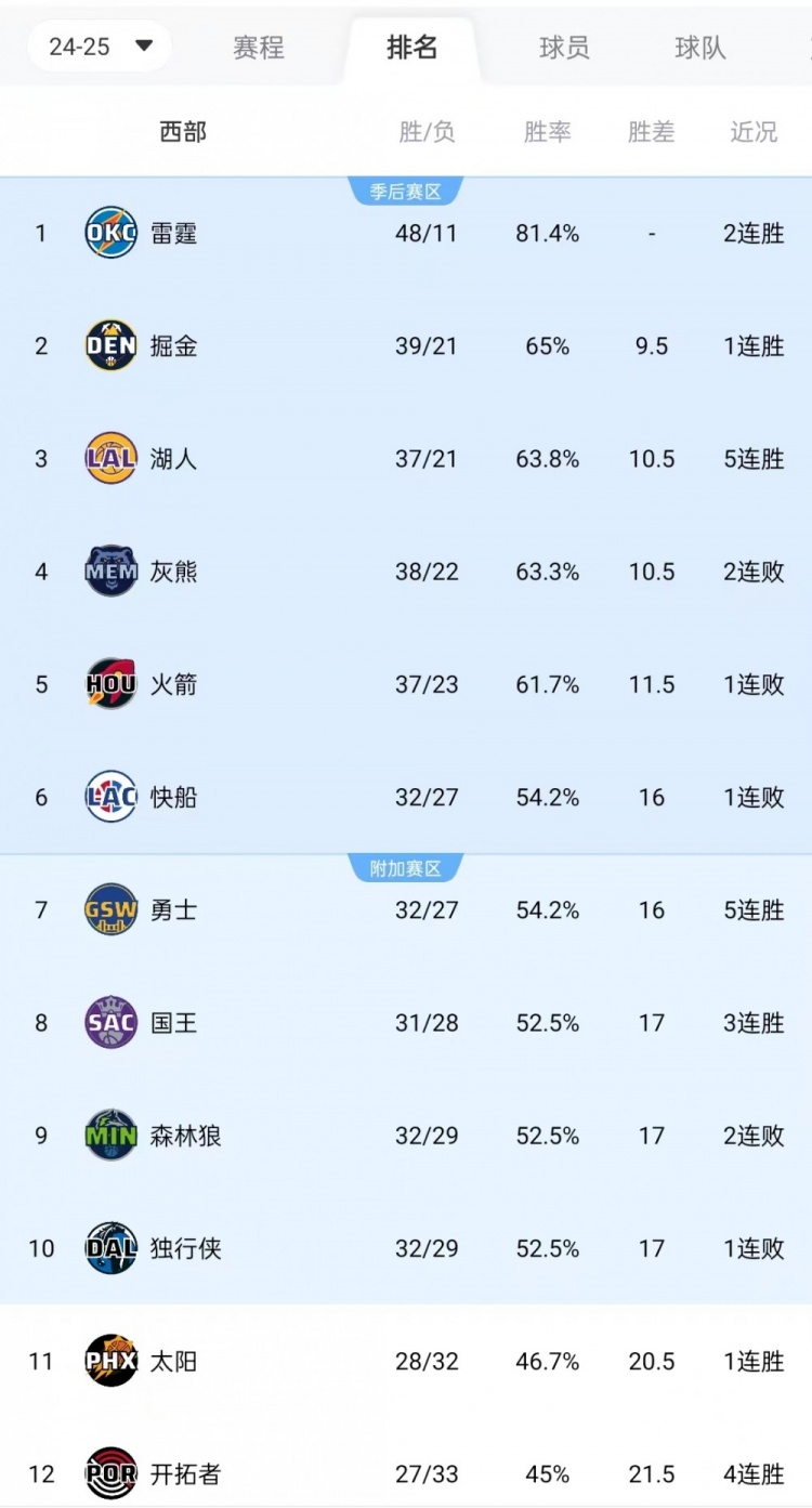 注:獨行俠與森林狼同戰(zhàn)績,但本賽季獨行俠對陣森林狼1勝2負,故排在森林狼之后。