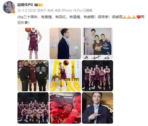 趙繼偉曬照并寫道:“cba三十周年,有激情,有回憶,有溫情,有感慨!很榮幸!很感恩????????再見長春! ???”