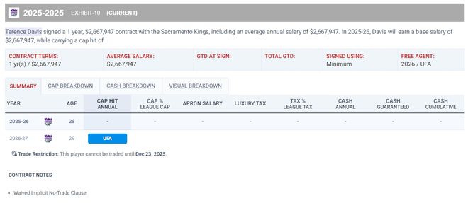 但我們會發(fā)現(xiàn)特倫斯-戴維森的合同細(xì)節(jié)很模糊,他并不是一份全額的保障性合同,國王隊(duì)也從未披露過他的合同細(xì)節(jié),根據(jù)NBA記者肯尼-史密斯的報道,戴維森很可能跟國王簽下的是Exhibit10合同,國王可以在新賽季開啟前裁掉他,讓他去發(fā)展聯(lián)盟代表國王打球。