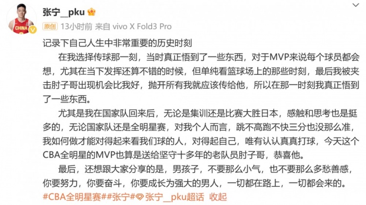 雖然得到20分3籃板3助攻的張寧距離MVP僅有一步之遙,但他卻表示并不遺憾:“在我選擇傳球那一刻,我真正悟到了一些東西。MVP每個球員都會想,尤其在當(dāng)下發(fā)揮還不錯的時候,但最后我被夾擊,鄒雨宸機(jī)會比我好,我就應(yīng)該傳給他。”
