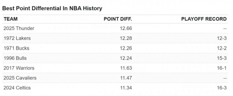 (圖為NBA歷史上的最高凈勝分紀(jì)錄,第一列為球隊,第二列為場均凈勝分,第三列為季后賽戰(zhàn)績)