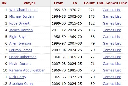 據(jù)統(tǒng)計(jì),這是庫(kù)里生涯第70場(chǎng)比賽40+,追平賈巴爾和里克巴里,并列歷史第10。