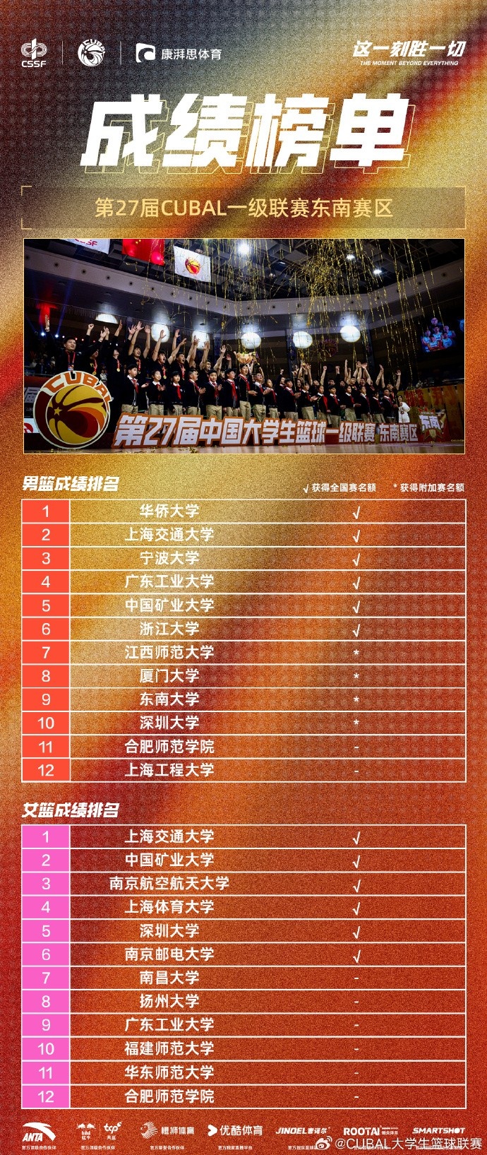 東南賽區(qū)結(jié)束,男籃方面華僑大學(xué)、上海交大、寧波大學(xué)、廣東工大、中國礦大、浙江大學(xué)直通全國三十二強(qiáng),江西師大、廈門大學(xué)、東南大學(xué)、深圳大學(xué)落入附加賽。