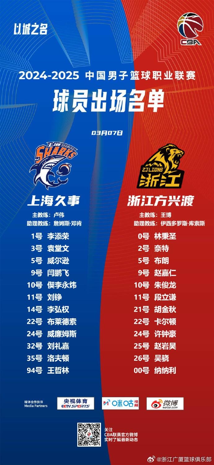 上海VS廣廈大名單:小胖王哲林胡金秋領(lǐng)銜 朱俊龍?jiān)诹?孫銘徽缺陣