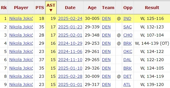據(jù)統(tǒng)計(jì),這是約基奇本賽季第10場(chǎng)比賽送出至少15助攻,僅次于特雷-楊(14場(chǎng)),而且約基奇這10場(chǎng)全勝!