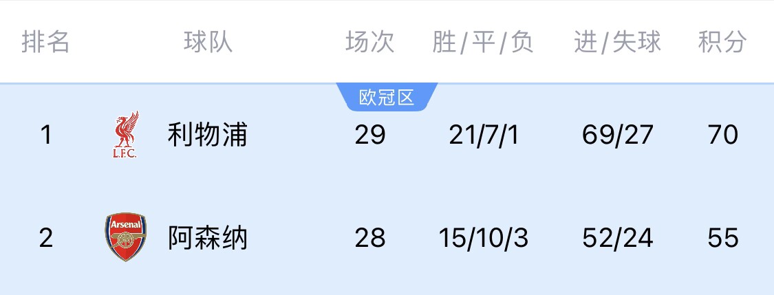 如果利物浦贏得接下來的兩場(chǎng)比賽,拿到76分;而阿森納恰好四連敗,即4月13日21:00利物浦主場(chǎng)迎戰(zhàn)西漢姆之前,紅軍已提前鎖定冠軍。