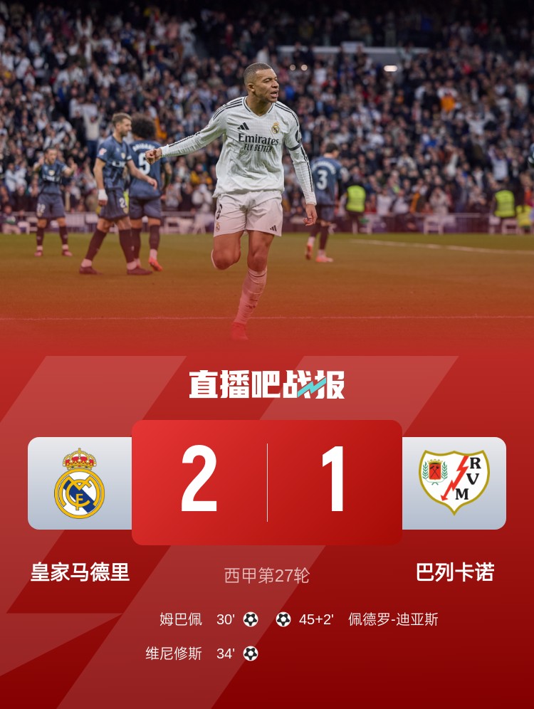 皇馬本輪2-1擊敗巴列卡諾,姆巴佩、維尼修斯破門,皇馬多賽平榜首!