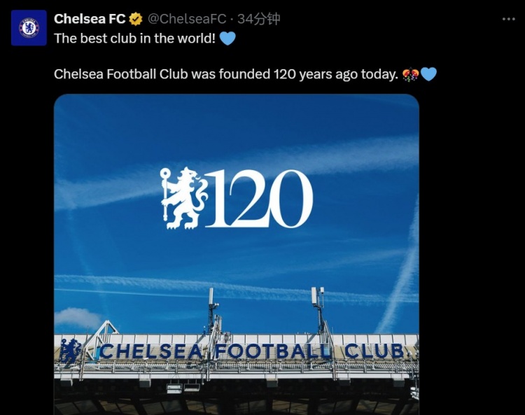切爾西官推表示:“世界最佳俱樂部!切爾西在120年前的今日正式創(chuàng)立!”