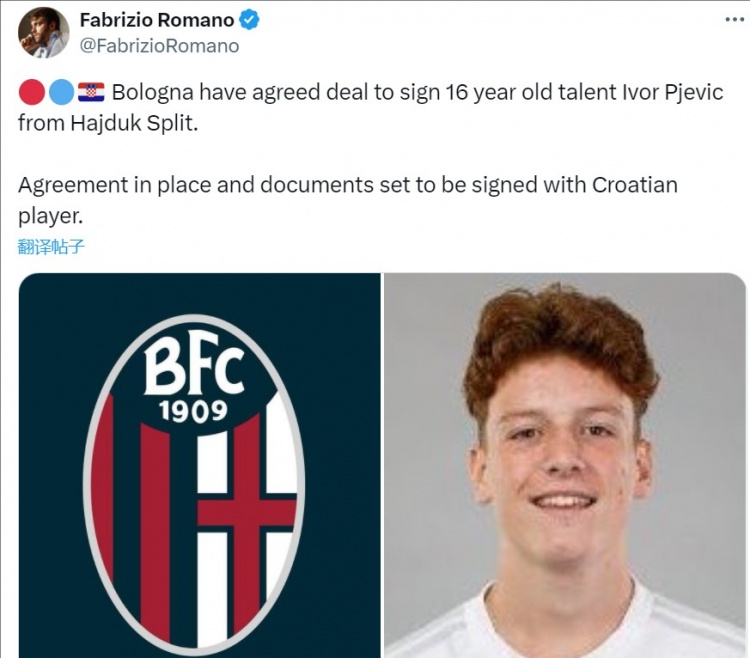 羅馬諾:博洛尼亞簽下克羅地亞16歲天才伊沃爾-普耶維奇