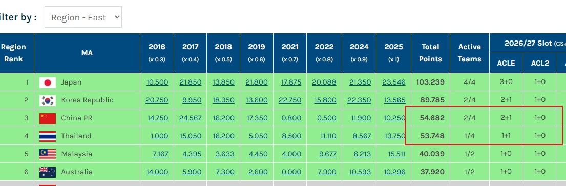 在泰山退賽情況下,目前中超球隊在亞冠賽場僅剩海港、申花兩隊爭取技術分。目前中國積分為54.682,身后泰國積53.748分虎視眈眈。一旦中國被泰國超越,那么26/27亞冠精英聯(lián)賽的名額將縮減為1+1。