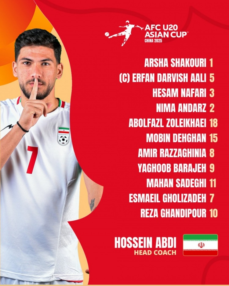 伊朗U20首發(fā):1-阿爾沙-沙庫里、18-阿博法茲-佐雷哈伊、3-希薩姆-納法里、5-埃爾凡-達爾維沙利、4-尼瑪-安達日、11-馬漢-薩德吉、15-莫賓-德甘、8-阿米爾穆罕默德-拉扎吉尼亞、9-雅古-布巴拉吉、7-埃斯梅爾-格霍利扎德、10-雷薩-甘迪普爾
