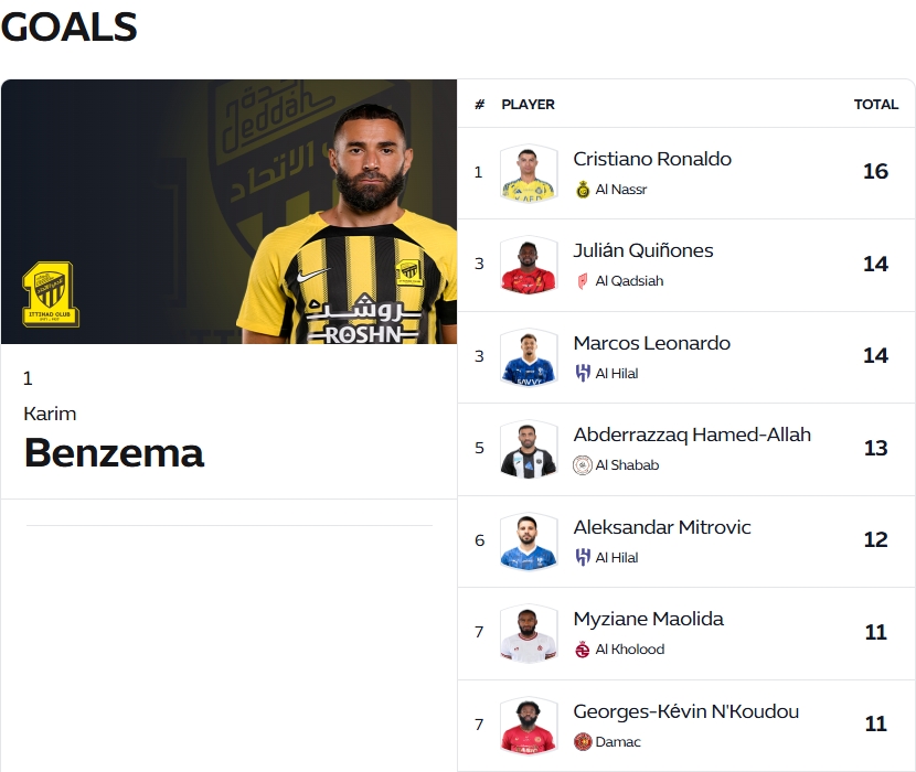 本場過后,本澤馬以18場16球的聯(lián)賽數(shù)據(jù),登上沙特聯(lián)射手榜頭名的位置,他與C羅均打入16球。