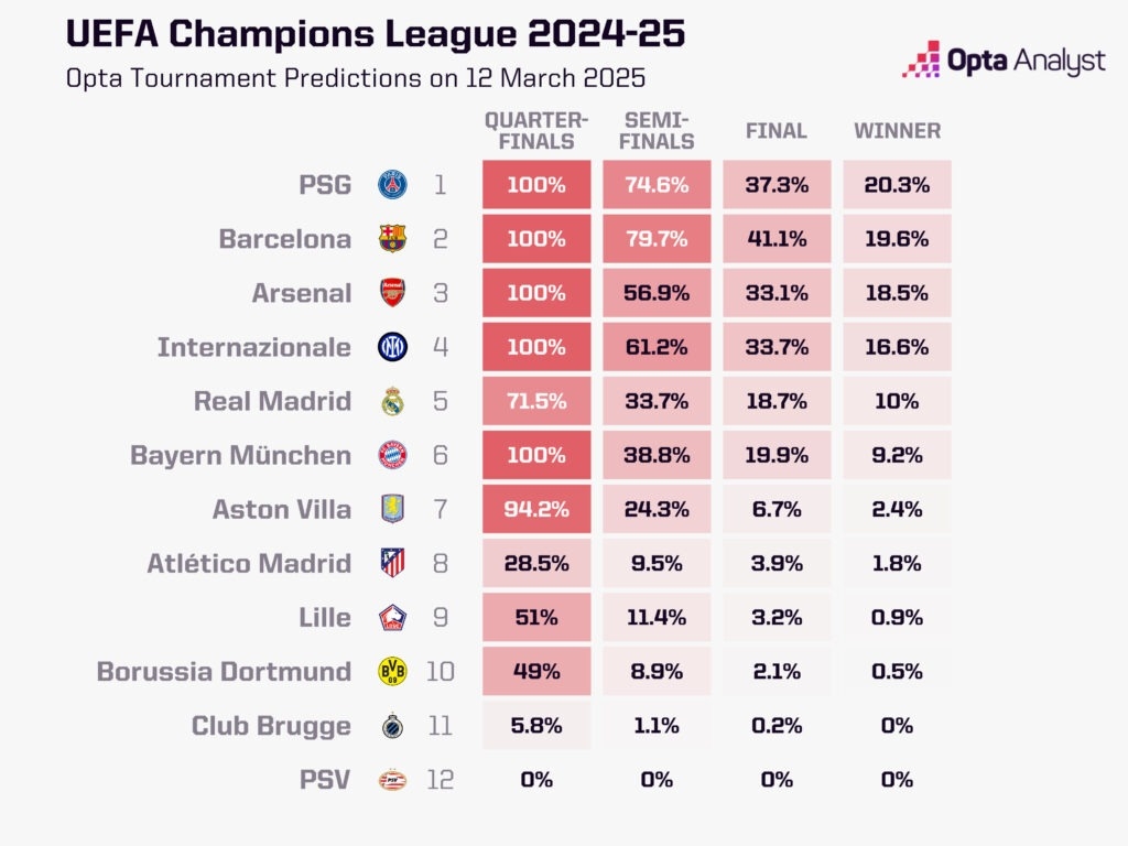 03月12日訊 歐冠1/8決賽次回合先賽4場,巴黎、巴薩、國米和拜仁晉級,opta給出了最新的歐冠奪冠概率,其中淘汰此前opta最看好的利物浦而晉級的巴黎居首,巴薩第2,阿森納、國米、皇馬、拜仁緊隨其后。