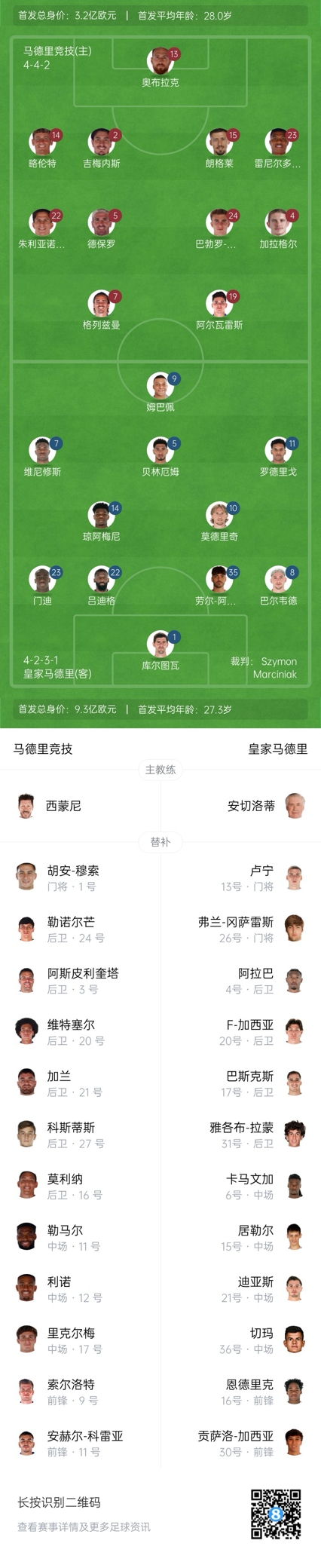 馬競(jìng)首發(fā):13-奧布拉克、14-略倫特、2-吉梅內(nèi)斯、15-朗格萊、23-雷尼爾多、22-西蒙尼、5-德保羅、8-巴里奧斯、4-加拉格爾、7-格列茲曼、19-阿爾瓦雷斯