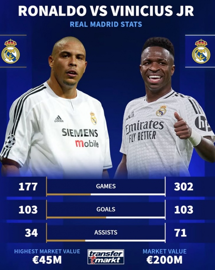 羅納爾多為皇馬出戰(zhàn)177場,貢獻(xiàn)103球34助攻,巔峰德轉(zhuǎn)身價4500萬歐。維尼修斯則在302場為皇馬貢獻(xiàn)103球71助攻,巔峰德轉(zhuǎn)身價2億歐。
