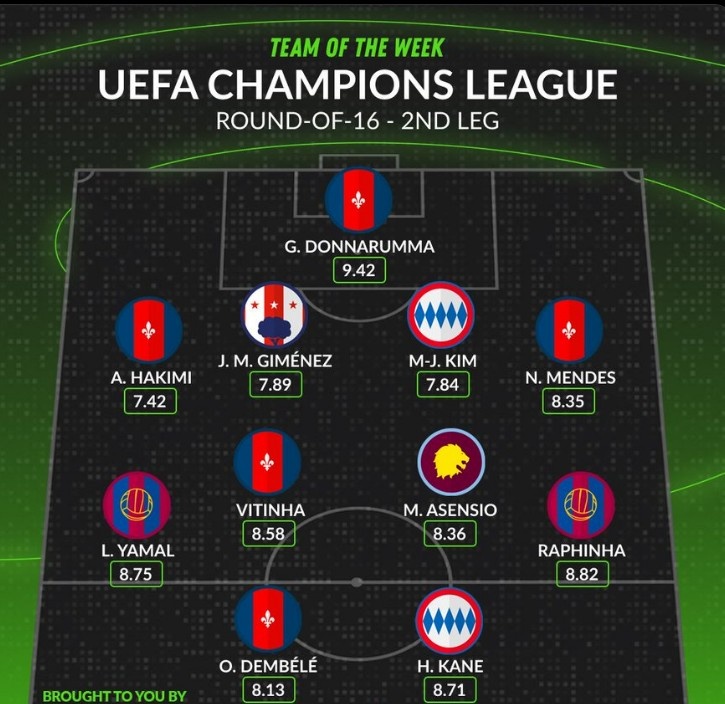 3月13日訊 歐冠16強戰(zhàn)次回合結(jié)束,數(shù)據(jù)網(wǎng)站W(wǎng)hoscored也盤點了本輪比賽最佳陣容,亞馬爾、凱恩、登貝萊等在列,具體如下: