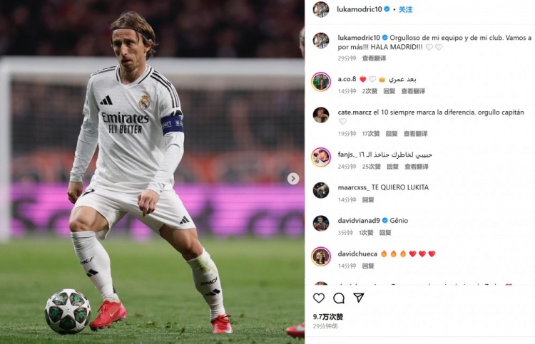 莫德里奇曬出自己的比賽照并配文:“我為我的球隊和俱樂部感到驕傲。讓我們繼續(xù)贏得更多!?。●R德里前進(jìn)?。?!”