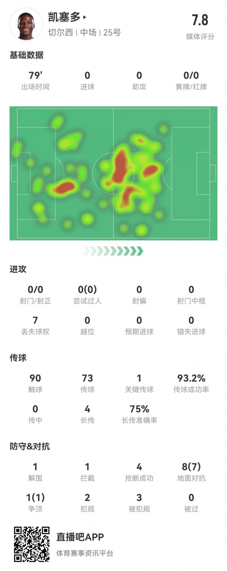 凱塞多本場9對抗8成功+4搶斷3造犯規(guī) 3成功長傳 獲評7.8分