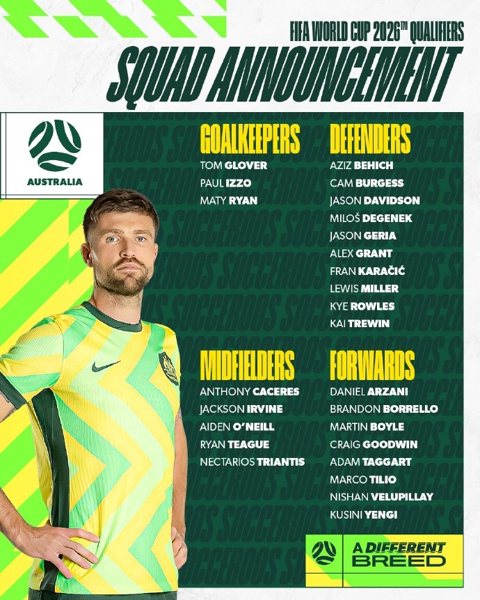 四位新人是31歲的前津門虎外援格蘭特(悉尼FC)、23歲的特里溫(墨爾本城)、23歲的華裔混血后腰泰格(墨爾本勝利)和21歲的希臘裔后腰特里安蒂斯(愛爾蘭人,蘇超)進入名單,他們都是第一次入選。此外,33歲的希臘裔中衛(wèi)戴維森(泛塞雷,希臘超)和28歲的克羅地亞裔右后衛(wèi)弗蘭契奇(薩格勒布火車頭,克羅地亞甲),也都時隔兩年多重返國家隊。