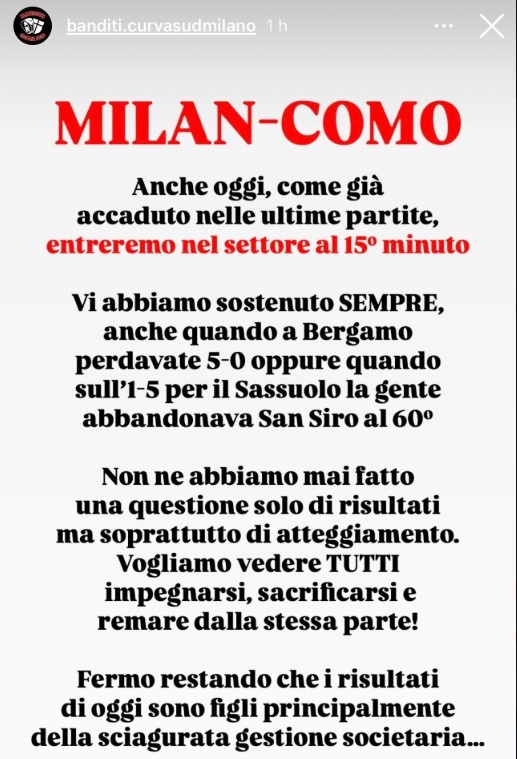 3月15日訊 米蘭南看臺(tái)發(fā)文,表示將在本輪對陣科莫的意甲聯(lián)賽繼續(xù)抗議。